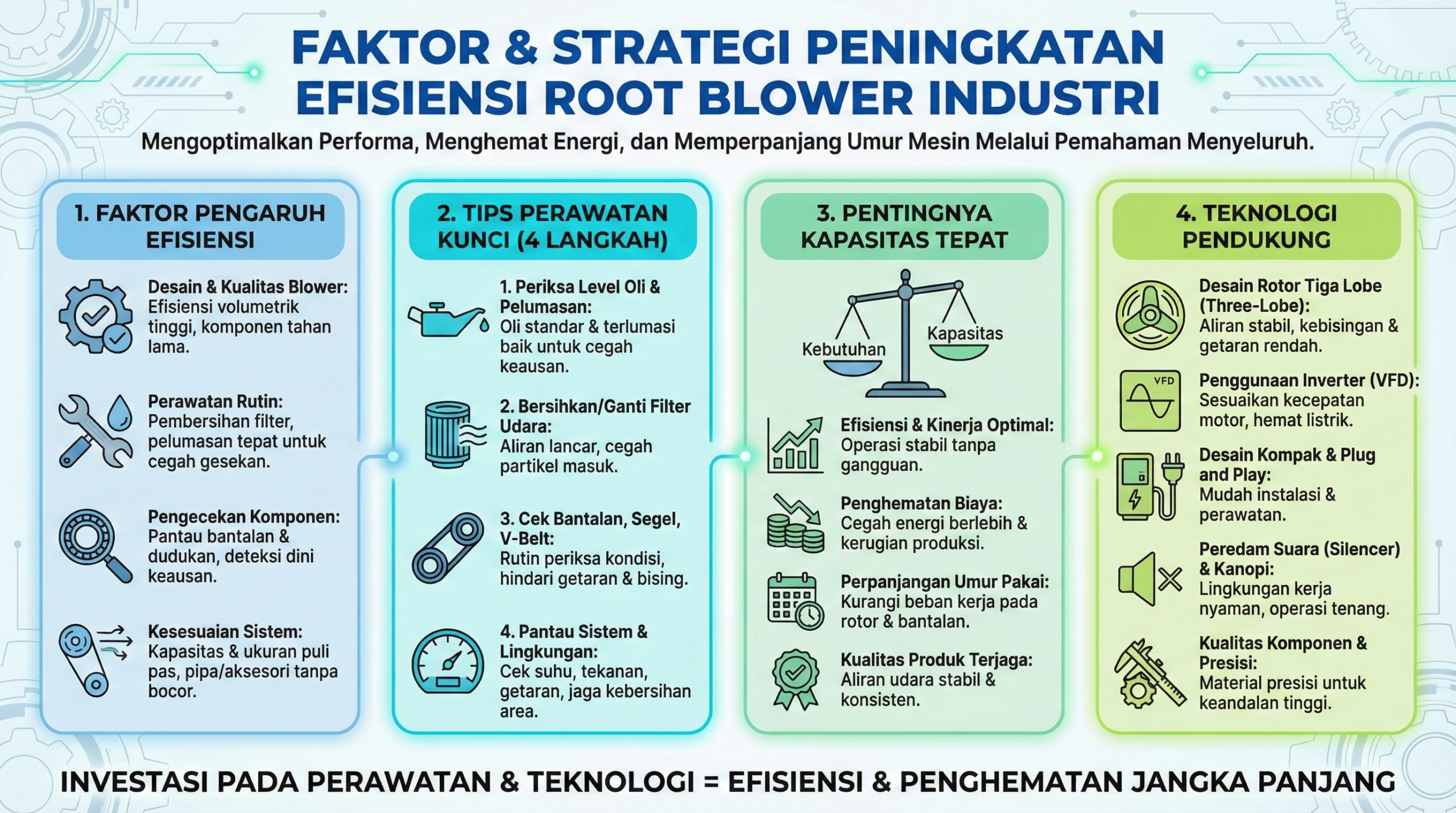 Menjaga efisiensi Root blower bukan hanya soal menghemat energi, tetapi juga memperpanjang umur pakai alat. Perawatan rutin, pemilihan kapasitas tepat, dan teknologi modern akan memastikan performa blower tetap optimal.