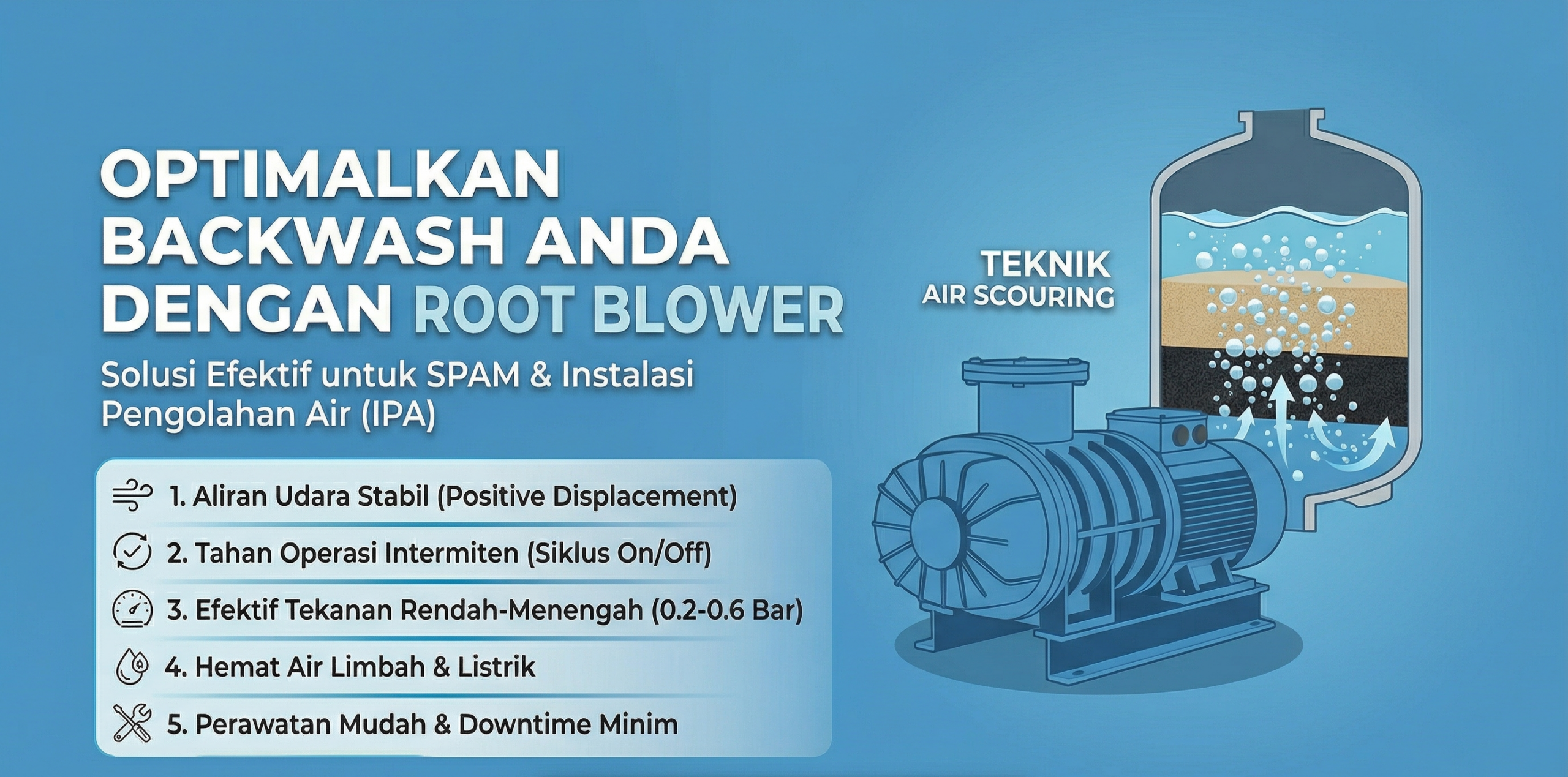 Jika dibandingkan denganblower turbo yang mahal atauring bloweryang mudah kewalahan di kapasitas besar,root blower tetap jadi pilihan paling rasional untuk SPAM/WTP. Berikut rincian manfaat dan keunggulan utamaroot blower untukbackwash SPAM/WTP: