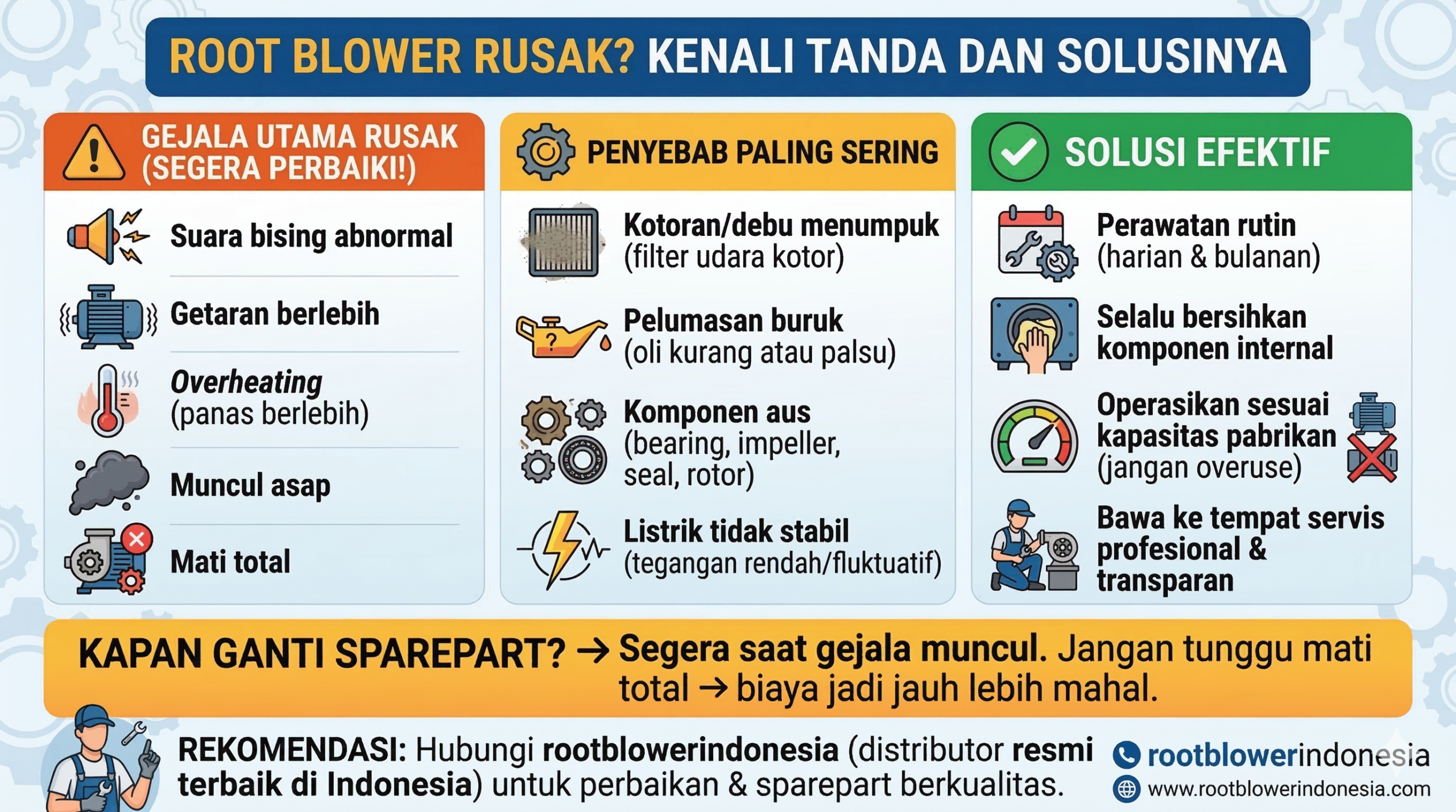 Hal ini berkaitan dengan biaya perbaikan yang justru semakin tinggi jika mesinroot blowermati total. Lebih cepat menggantisparepartmesinroot blower,maka semakin baik untuk mencegah kerusakan lebih parah.